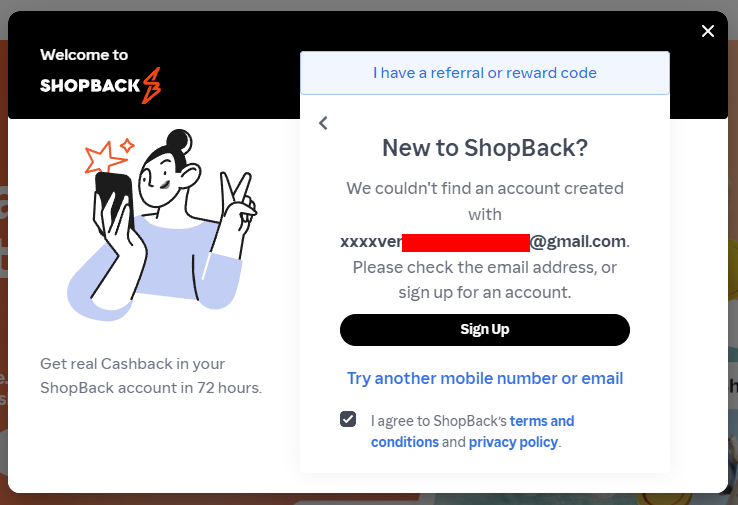 I simply added some character’s in front of the email address and ShopBack happily confirmed that address didn’t exist. However, remove the invalid characters and there’s a very different response:
