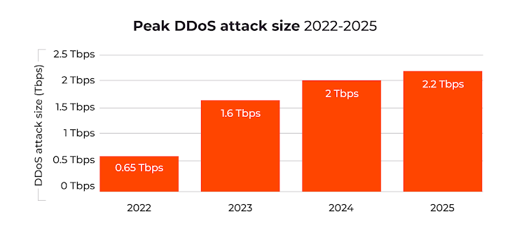 - Attack size continues to grow. The peak attack of 2.2 Tbps demonstrates the increasing scale and destructive potential of modern DDoS campaigns.