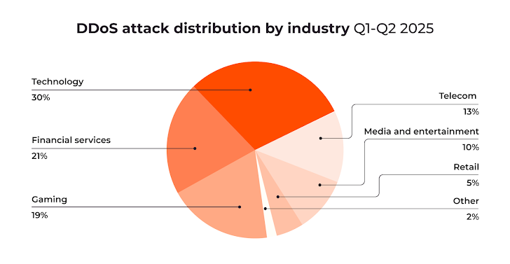 Technology now represents 30% of all DDoS attacks, overtaking gaming (19%). Hosting providers supporting SaaS, e-commerce, gaming, and financial clients are particularly vulnerable, as a single attack can trigger ripple effects across multiple dependent businesses.