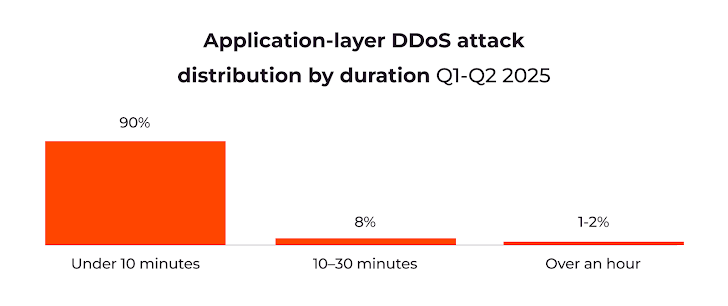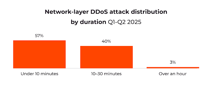Short bursts remain preferred. Despite longer attacks gaining prevalence, brief attacks remain highly disruptive, evading automated defenses and often serving as smokescreens for multi-stage cyberattacks.