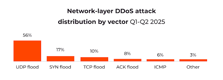In terms of network-layer attack vectors, UDP flood attacks remain dominant, accounting for 56% of network-layer attacks, followed by SYN floods (17%), TCP floods (10%), ACK floods (8%), and ICMP (6%). Multi-vector approaches allow attackers to mask malicious activity as legitimate traffic.