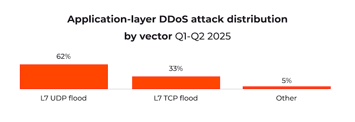L7 UDP floods dominate (62%), followed by L7 TCP floods (33%), with other attack types at 5%. Attackers increasingly exploit business logic and APIs to disrupt operations beyond traditional network overload.