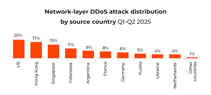 The United States and the Netherlands remain top sources for network-layer attacks. Hong Kong emerges as a new significant source, contributing 17% of network-layer and 10% of application-layer attacks.