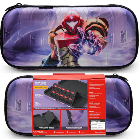 PowerA’s Slim Carrying Case for Nintendo Switch 2 has Metroid Prime 4: Beyond’s cover art on the front and back of the hardshell exterior. The inside of the case has soft lining, a built-in console stand, and slots for 10 games.
