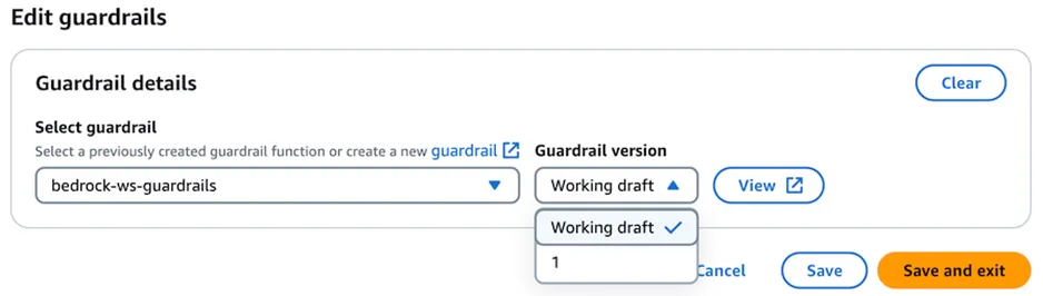 4. In the Select guardrail dropdown, select the guardrail that you just created, then for Guardrail version select either the Working draft or the deployed version you created.